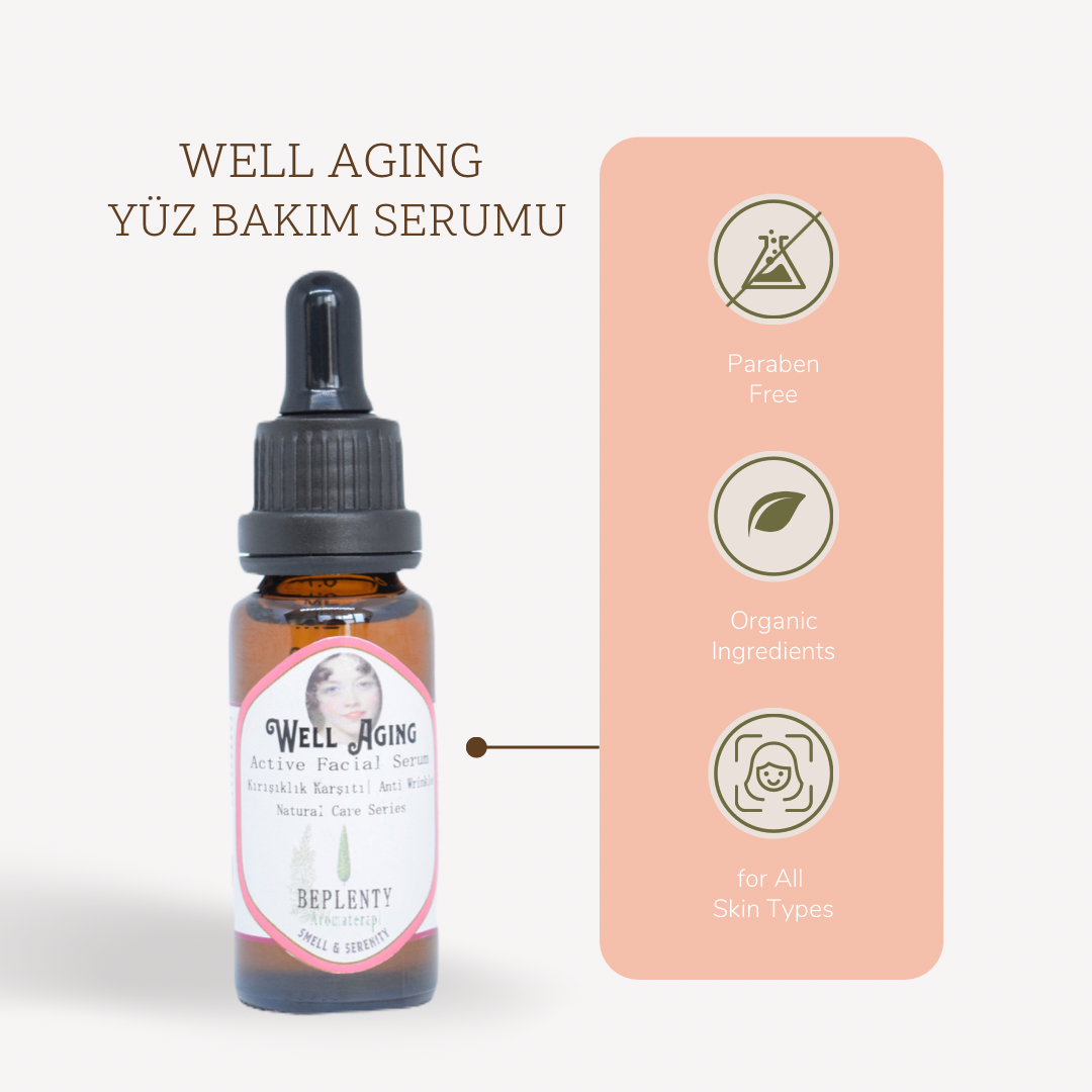 Beplenty Well-aging Yüz serumu, En kaliteli ve yaşlanmaya karşı etkili Kenevir, Çuha ve Hodan Yağlarıyla birlikte, yüksek E vitamini içeren, antiseptik Jojoba ve güneş ışınlarının zararlı etkilerine karşı avokado yağı cildi koruyucudur. Antioksidanlar, Vitamin A-C yönünden zengin Aloe Vera Ekstraktı bir çok cilt problemlerine karşı oldukça onarcı bir etki sağlar. Kayısı çekirdeği yağı Gamma tokoferol’ce zengindir, cilt üzerinde emilerek, cilde doğal bir ışıltı verir.
